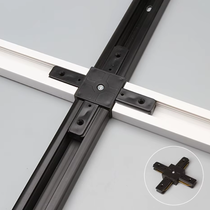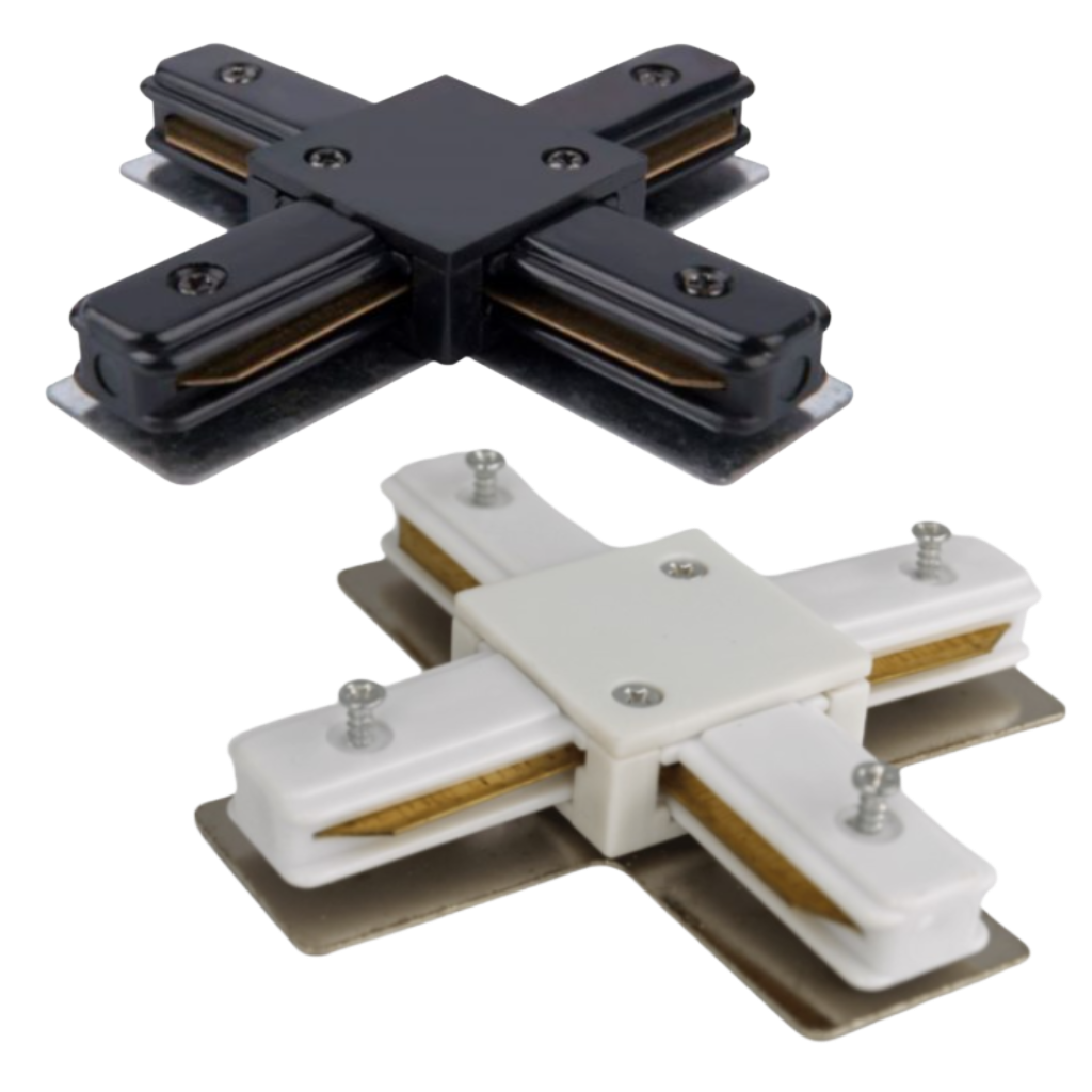 Conector X Riel Monofásico Protek, útil para conectar y extender tramos de riel logrando luminarias de mayor dimensión.