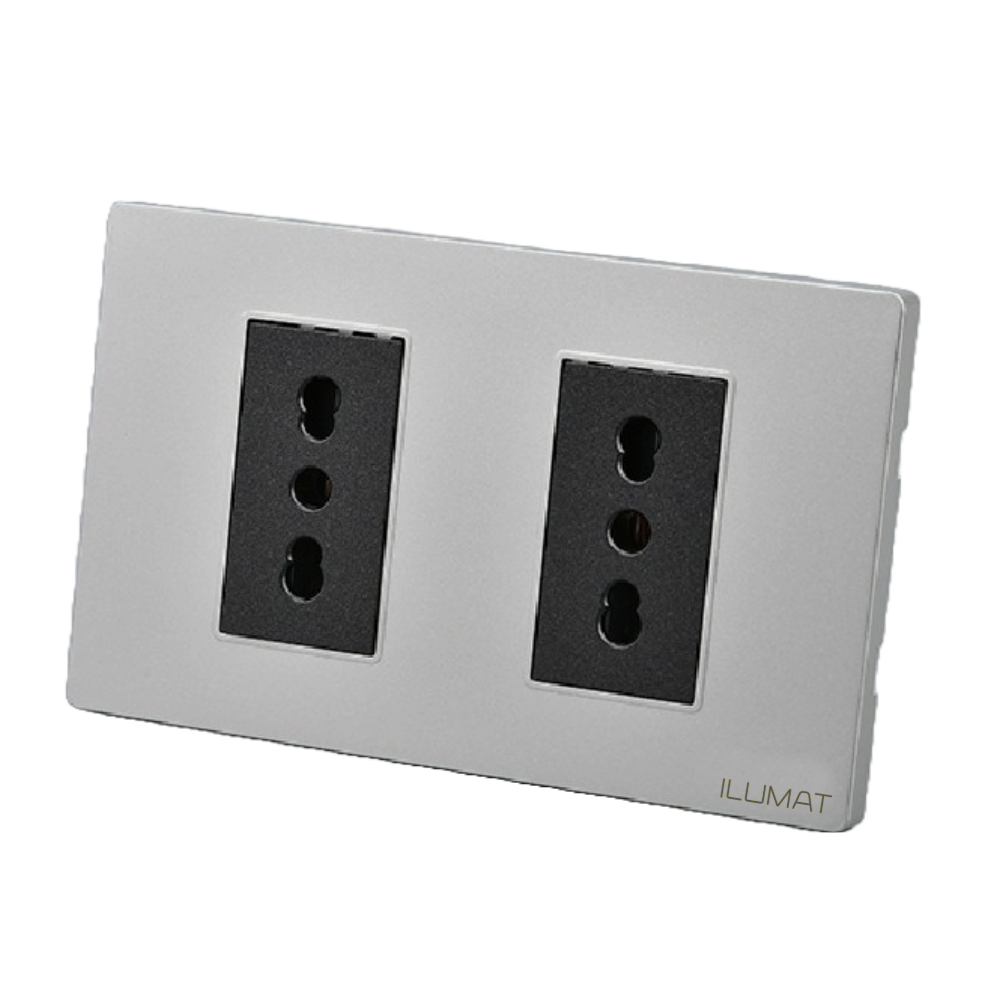 Enchufe Doble 10/16ah Placa Metalica Certificado SEC, equipo elegante, de placa metalica resistente, iluminación interior. Equipo disponible en placa color titanio con modulo negr0 o placa champagne modulo blanco. Equipo cuenta con certificación SEC