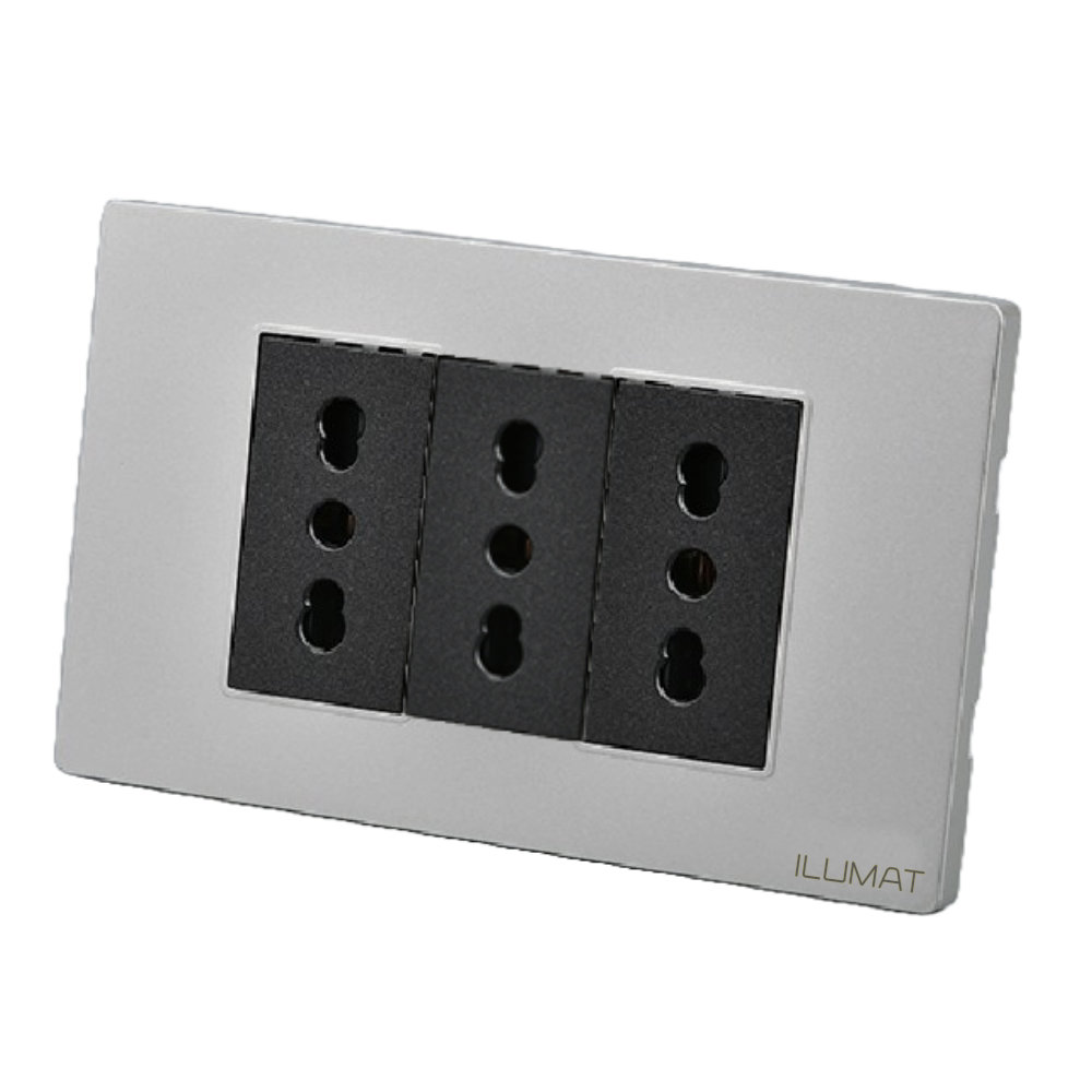 Enchufe Triple 10/16ah Placa Metalica Certificado SEC, equipo elegante, de placa metalica resistente, iluminación interior. Equipo disponible en placa color titanio con modulo negr0 o placa champagne modulo blanco. Equipo cuenta con certificación SEC