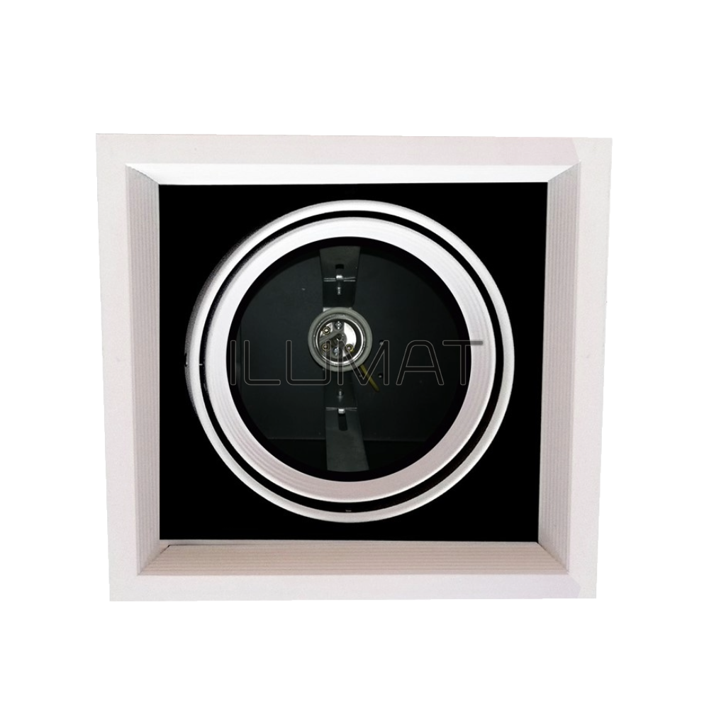 Foco Par30 Embutido Puzzle, blanco mate, o conocido como foco domino, ideal para cielos interiores. Fabricado en aluminio con bisel plano, cuenta con base cerámica E27. Su diseño cuadrado permite una instalación elegante y moderna en cielos falsos o paneles técnicos. Este equipo es perfecto para iluminación retail, iluminación comercial, ideal para iluminar productos, objetos de manera puntual